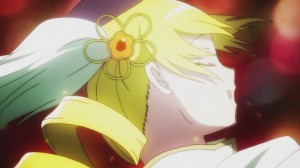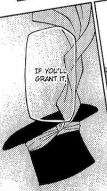 In closeups in the manga as well as in the artbook, the roses are different. There is one big rose and two smaller roses. In the manga panel above, the two smaller roses are to the right of the big rose. In this artbook piece, the big rose is to the right. (Note also that it clarifies that knot in front to actually be more of the sash looping around itself as in the back. Without testing it I’m not sure if this is possible)