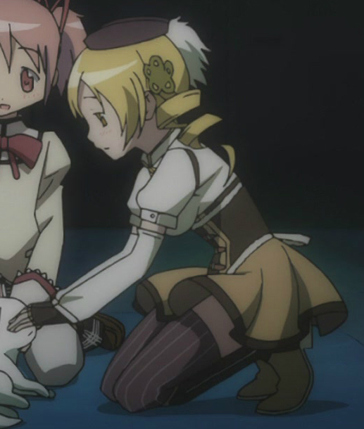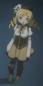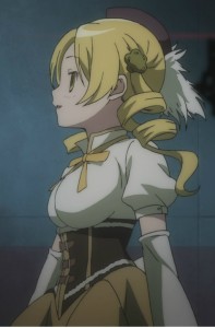 Under the arm covers, Mami wears a pair of tight brown fingerless gloves. They’re like gloves with the fingers cut off, only intentionally. They match the corset, with the mustard yellow trim at the ends of the fingers. As we never see her wrists bare, they probably go up far enough under the cuff to make sure they never slip out.