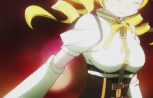 It’s a mini-crown that is a little bit of a fascinator, because of the sheer black fabric coming down over the side. It probably pins underneath with a clip or a hatpin (or multiples thereof). This sheer black fabric is what covers the base of the crown. It only comes down the one side, though. It layers downwards similar to the cravats worn by other characters (Break, Gilbert), and the edge is finished with black tatted or crocheted lace. (I would put my money on tatted, personally. Crochet-work tends to be a little thicker for the volume shown; although I’m neither a tatter nor a doily-crocheter.)